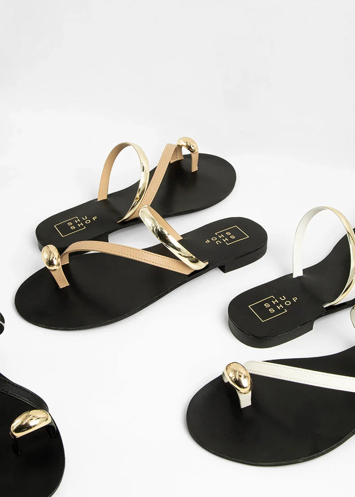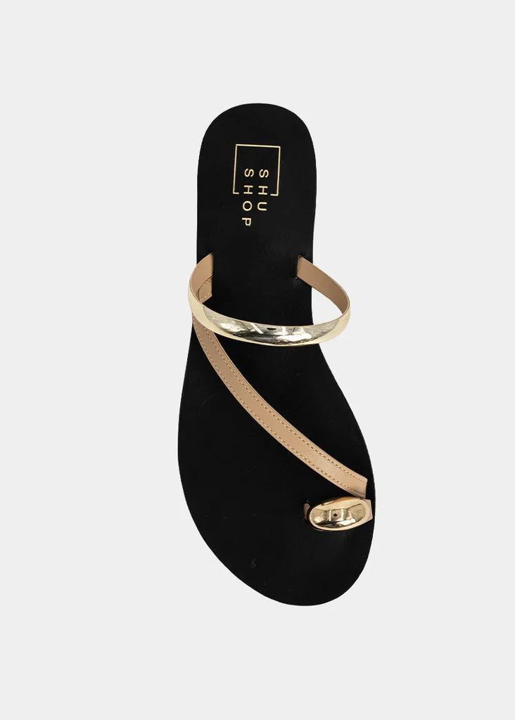 Polished yet barely there, BRENDA NUDE is your new go-to sandal for effortless elegance. Designed with minimal nude-tone straps and striking gold accents, this sleek flat combines comfort with high-shine detail. Whether you're city strolling or heading to brunch, it’s the ultimate warm-weather essential.